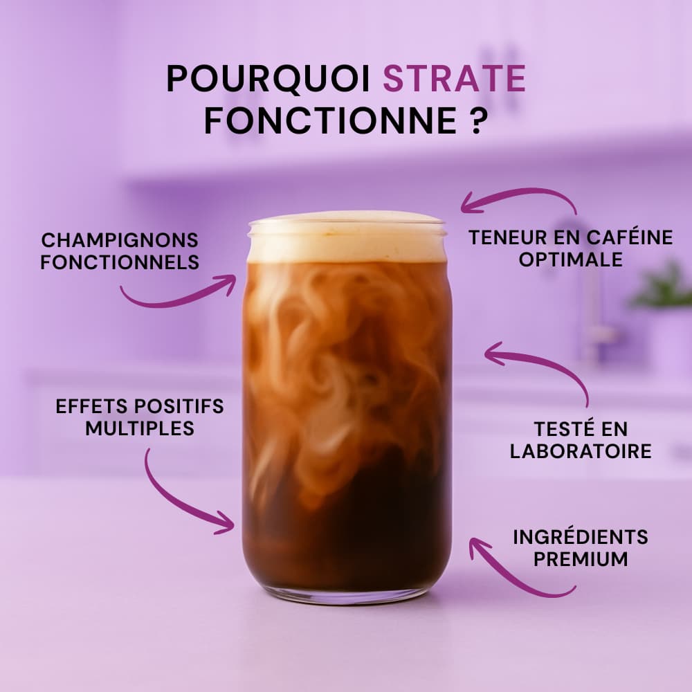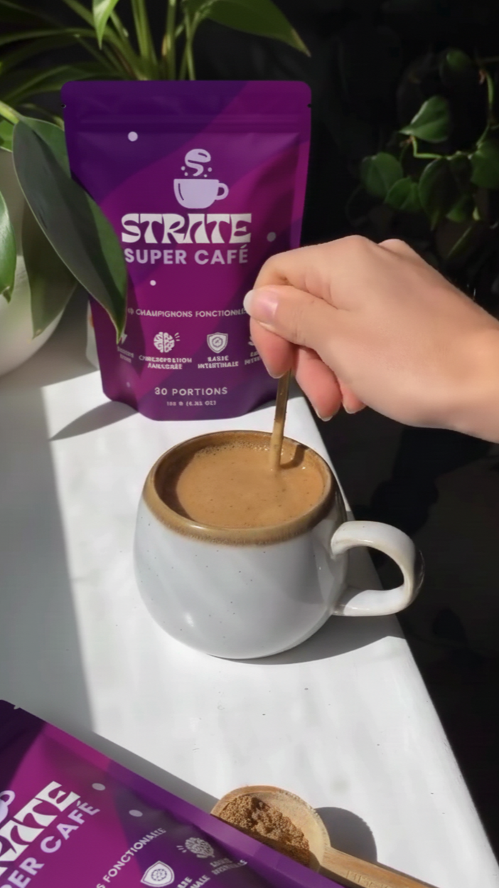Si vous aimez le café, mais que vous n'appréciez pas le stress, l'anxiété ou le coup de mou qui suivent, le café aux champignons Strate est fait pour vous ! Certains remplacent entièrement leur café par du Strate, d'autres remplacent leur deuxième ou troisième café, et certains préfèrent l'ajouter à leur café habituel pour un coup de fouet !